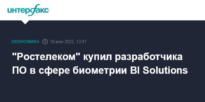 Москва. 16 мая. INTERFAX.RU - ПАО "Ростелеком" приобрело 100% ООО "Би Ай Солюшнс" (BI Solutions, разработчик ПО в области биометрии), свидетельствуют данные ЕГРЮЛ.