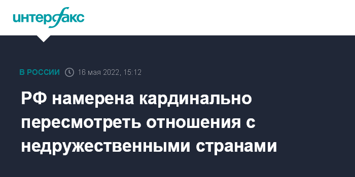 Москва. 16 мая. INTERFAX.RU - Россия пересмотрит отношения с недружественными странами и учтет агрессивный курс Запада в новой редакции Концепции внешней политики, заявили в МИД РФ.