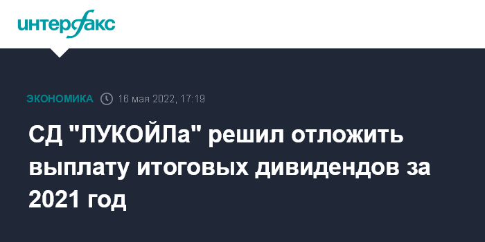 Москва. 16 мая. INTERFAX.RU - Совет директоров "ЛУКОЙЛа", учитывая нестабильные условия ведения деятельности и ограничения в учетных и банковских системах, принял решение отложить выплату итоговых дивидендов за 2021 год, сообщает компания.