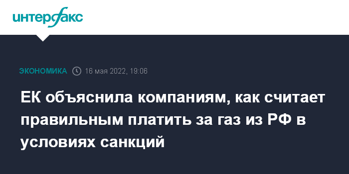 "Еврокомиссия заявила, что импортеры из ЕС могут продолжать платить за российский газ, не нарушая санкции против Москвы", - говорится в сообщении.