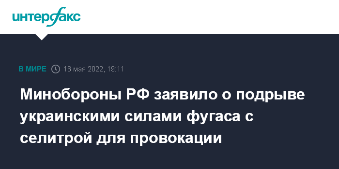 Москва. 16 мая. INTERFAX.RU - Министерство обороны РФ заявило, что украинские спецслужбы устроили провокацию, взорвав фугас с аммиачной селитрой, для обвинения российской армии в применении отравляющих веществ.