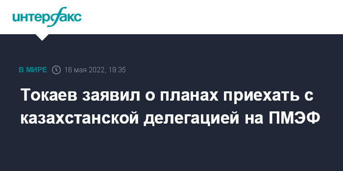 Москва. 16 мая. INTERFAX.RU - Президент Казахстана Касым-Жомарт Токаев заявил, что возглавит делегацию своей страны на очередном Петербургском международном экономическом форуме.