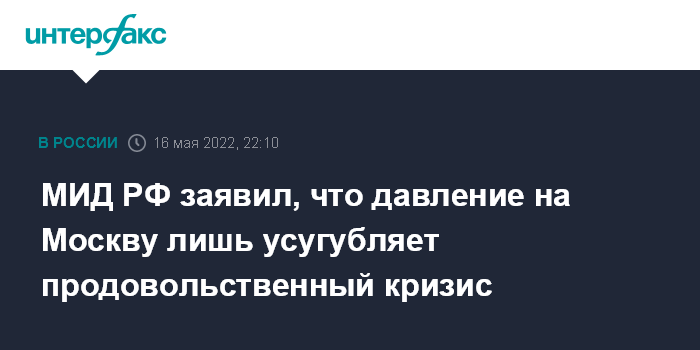 Москва. 16 мая. INTERFAX.RU - Попытки экономически, финансово и логистически отторгнуть Россию от налаженных многолетних каналов международного сотрудничества лишь усугубляют экономический и продовольственный кризисы, заявили в МИД РФ.