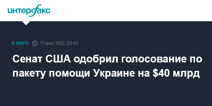 Москва. 17 мая. INTERFAX.RU - Сенат США большинством голосов поддержал голосование по пакету помощи Украине в размере $39,8 млрд, сообщают американские СМИ.