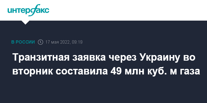 Москва. 17 мая. INTERFAX.RU - "Оператор ГТС Украины" принял от "Газпрома" заявку на транзит газа на вторник в объеме 48,9 млн кубометров.