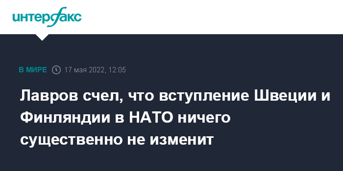 Москва. 17 мая. INTERFAX.RU - НАТО давно учитывает территорию Швеции и Финляндии в своем военном планировании, и вступление этих стран в Североатлантический альянс большой разницы не сделает, заявил во вторник глава МИД РФ Сергей Лавров.