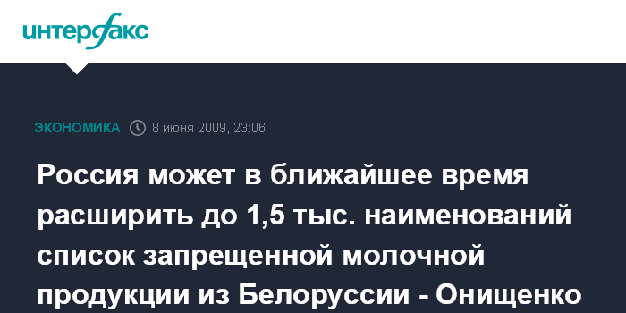 Москва. 8 июня. ИНТЕРФАКС - Список молочной продукции из Белоруссии, запрещенный к ввозу в РФ, в ближайшее время может вырасти до 1,5 тыс наименований, сообщил "Интерфаксу" в понедельник вечером руководитель Роспотребнадзора, главный государственный санитарный врач РФ Геннадий Онищенко.