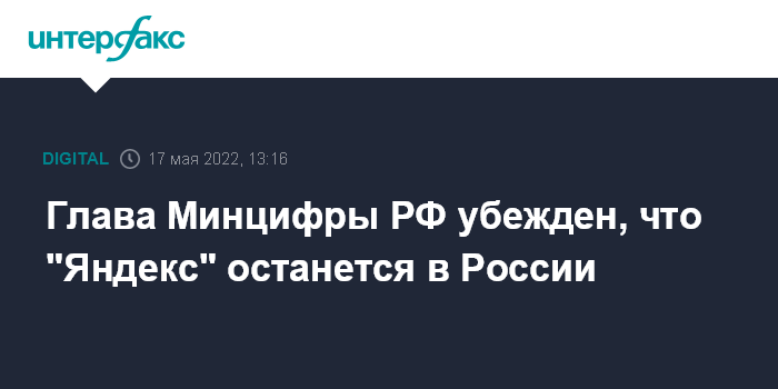 Москва. 17 мая. INTERFAX.RU - Российская компания "Яндекс" останется в России, заявил глава Минцифры РФ Максут Шадаев.