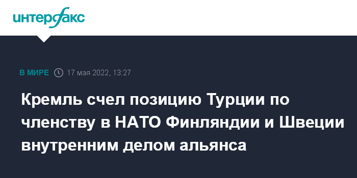 Отвечая на вопрос, допускают ли в Кремле наложение Турцией вето по вопросу о приеме в НАТО Финляндии и Швеции, Песков ответил: "Это не наш вопрос, он в рамках взаимоотношений государств-членов НАТО. Он к нам не имеет отношения".
