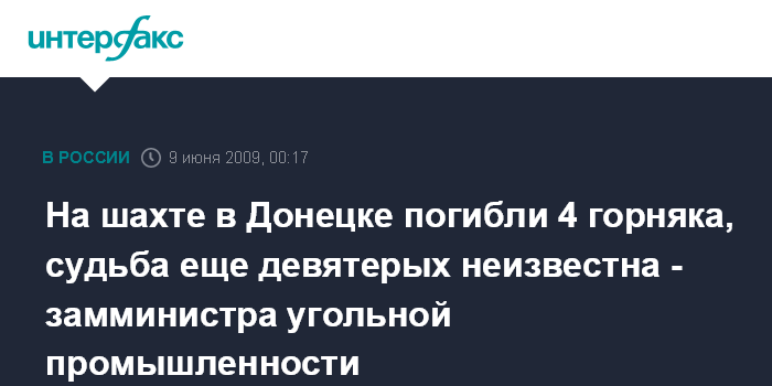 Киев. 9 июня. ИНТЕРФАКС-УКРАИНА - Спасатели обнаружили тела 4 шахтеров, погибших в результате аварии на шахте им. Скочинского в Донецке, сообщил замминистра угольной промышленности Юрий Грядущий в эфире 5 канала в понедельник вечером.