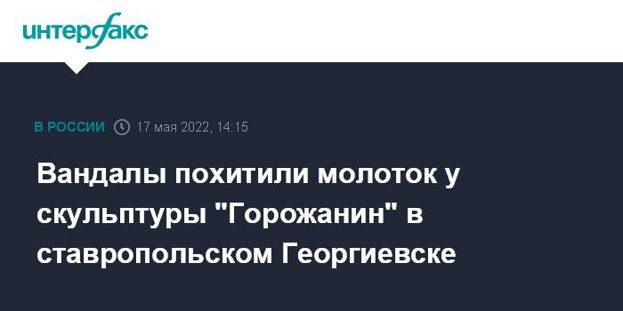 "К сожалению, у нас в городе произошел еще один случай вандализма, у скульптуры "Горожанин" похищен молоток...Это собирательный образ простого рабочего человека - обычного трудяги, который строил Георгиевск", - написал Зайцев в своем телеграм-канале.