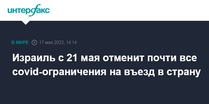 Ранее израильские власти сообщили об отмене с 21 мая ПЦР-тестирования на коронавирус по прибытии. В апреле было отменено требование о ношении масок в помещениях и открытых пространствах. Требование о ношении маски во время международного перелета сохраняется.