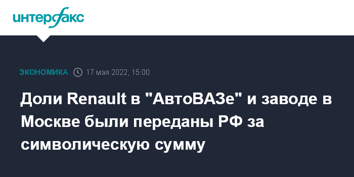 Доли Renault в "АвтоВАЗе" и заводе в Москве были переданы РФ за символическую сумму