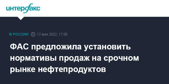 Москва. 17 мая. INTERFAX.RU - Федеральная антимонопольная служба (ФАС) предлагает установить нормативы продаж на срочном рынке нефтепродуктов для доминирующих компаний.