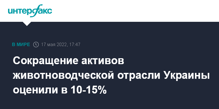 Москва. 17 мая. INTERFAX.RU - С 24 февраля активы животноводческой отрасли Украины сократились на 10-15%, преимущественно из-за потери контроля над производственными мощностями в зонах активных боевых действий и на территориях под контролем российской армии, сообщило Министерство аграрной политики Украины.