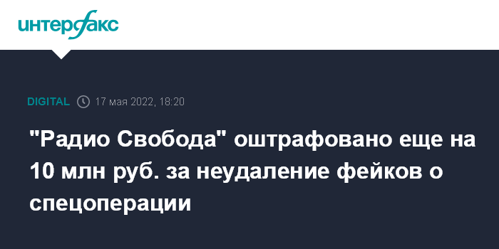 За аналогичные правонарушения, а также за неудаление контента, содержащего призывы к осуществлению экстремистской деятельности (ч. 4 ст. 13.41 КоАП РФ), 28 апреля, 13 и 16 мая тем же судом "Радио Свобода" было оштрафовано на 15 млн, 12,8 и 18 млн руб. соответственно.