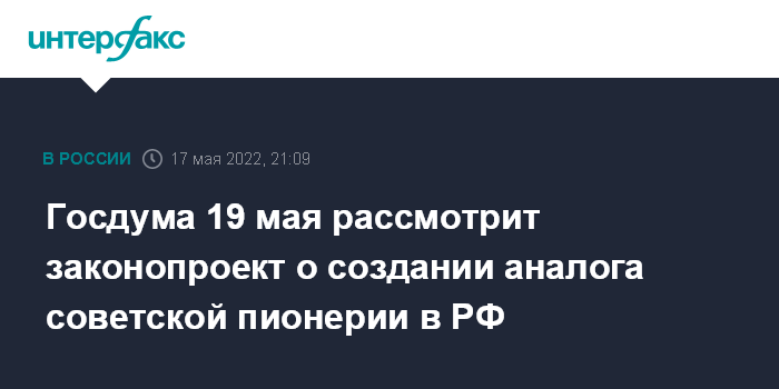 Москва. 17 мая. INTERFAX.RU - Законопроект о создании единой детской общественной организации рассмотрят в Госдуме в день столетия пионерии 19 мая. Об этом в соцсетях сообщила глава комитета палаты Думы по вопросам семьи, женщин и детей Нина Останина.