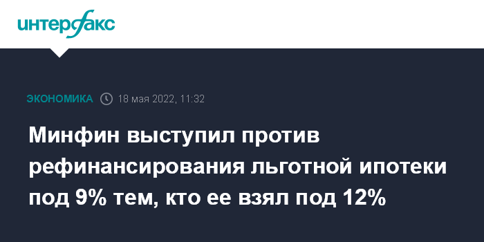 Минфин выступил против рефинансирования льготной ипотеки под 9% тем, кто ее взял под 12%