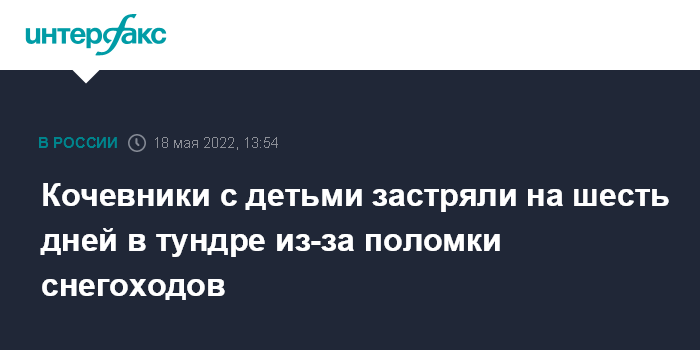 Москва. 18 мая. INTERFAX.RU - Группа из 14 кочевников с детьми на шесть дня застряла в тундре, вероятно, из-за поломки снегоходов, их эвакуировали спасатели "Ямалспаса", сообщили в департаменте гражданской защиты Ямало-Ненецкого автономного округа.