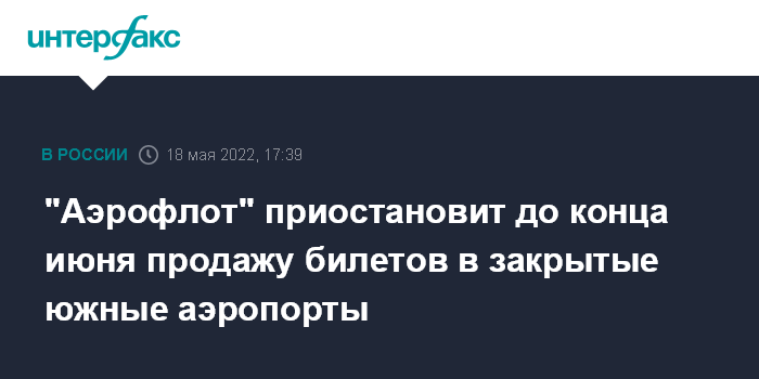 Москва. 18 мая. INTERFAX.RU - "Аэрофлот" приостановит до конца июня продажу билетов в города центральной и южной части РФ, аэропорты которых закрыты с 24 февраля из-за ситуации на Украине.