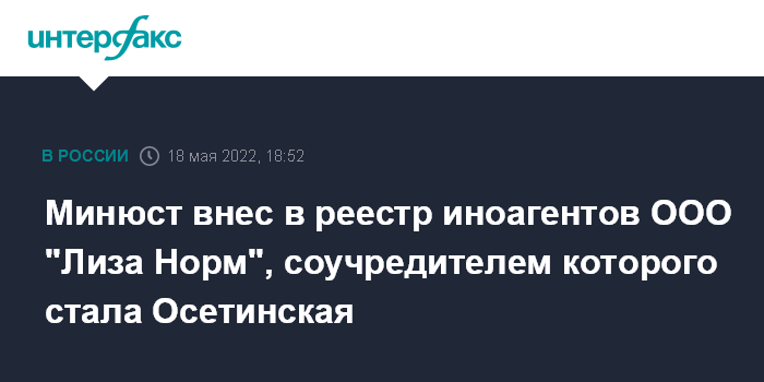 Москва. 18 мая. INTERFAX.RU - Минюст РФ внес в реестр иностранных СМИ, выполняющих функции иностранного агента, ООО "Лиза норм".