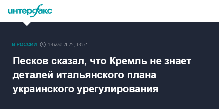 Москва. 19 мая. INTERFAX.RU - В Кремле не знакомы с деталями разработанного, по информации итальянских СМИ, властями этой страны плана украинского урегулирования и не знают, передавался ли этот проект российским властям по дипломатическим каналам, сообщил пресс-секретарь президента РФ Дмитрий Песков.
