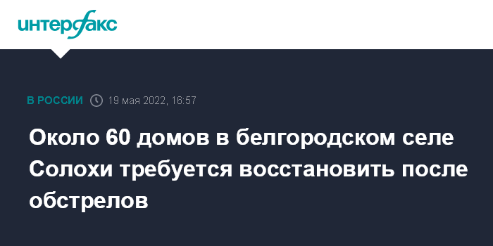 Москва. 19 мая. INTERFAX.RU - Восстановительные работы в подвергшемся очередному обстрелу с украинской стороны селе Солохи Белгородского района Белгородской области возобновят после стабилизации ситуации, в ремонте нуждаются около 60 домов, сообщил губернатор региона Вячеслав Гладков.
