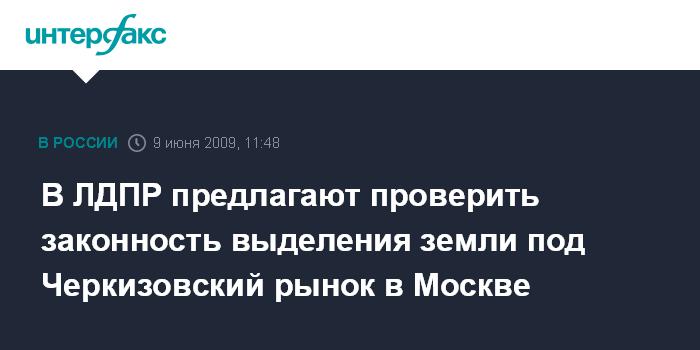 Москва. 9 июня. ИНТЕРФАКС - Парламентская фракция ЛДПР подняла вопрос о законности выделения земли под Черкизовский рынок в Москве. На заседании Госдумы во вторник член фракции ЛДПР Максим Рохмистров заявил, что 62 гектара, отведенных под Черкизовский рынок, являются федеральной землей. Он предложил дать поручение думскому комитету по собственности запросить в компетентных органах информацию о том, как было оформлено выделение обширного участка земли под Черкизовский рынок.
