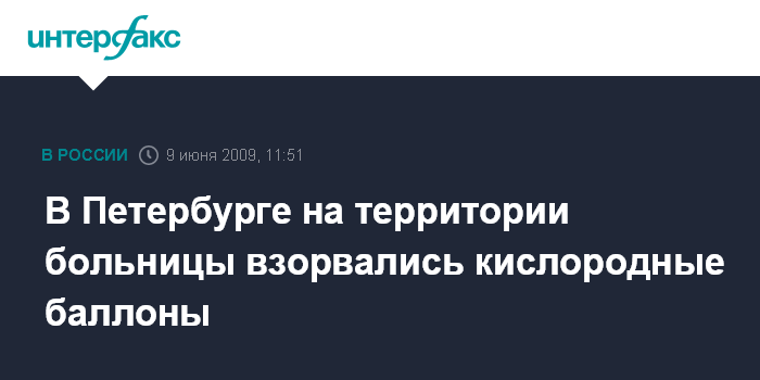 Москва. 9 июня. INTERFAX.RU - В Московском районе Петербурга на территории больницы N20 произошел взрыв кислородных баллонов, сообщили "Интерфаксу" в ГУ МЧС по городу. В госпитале, расположенном на улице Гастелло, 21, около 11:10 мск произошел взрыв в машине, перевозившей кислородные баллоны. По предварительной информации, пострадал водитель автомобиля.