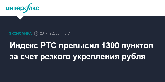 Москва. 20 мая. INTERFAX.RU - Индекс РТС, один из основных фондовых индикаторов, утром в пятницу превысил рубеж 1300 пунктов впервые с 21 февраля на фоне резкого укрепления рубля.