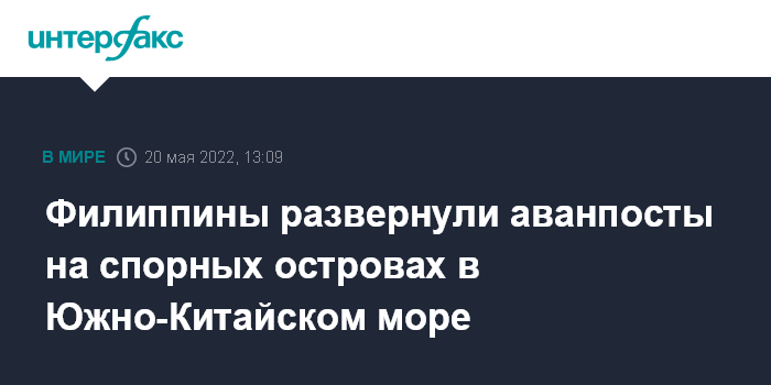 Москва. 20 мая. INTERFAX.RU - Береговая охрана Филиппин развернула передовые наблюдательные пункты на трех островах в акватории Южно-Китайского моря, являющейся объектом территориального спора Китая и других государств, сообщает South China Morning Post.