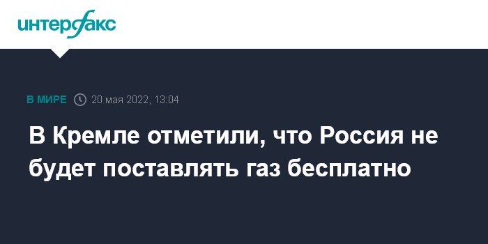 Москва. 20 мая. INTERFAX.RU - Россия не будет бесплатно поставлять газ в страны, которые отказались от перехода на новую схему оплаты, заявил пресс-секретарь президента РФ Дмитрий Песков.