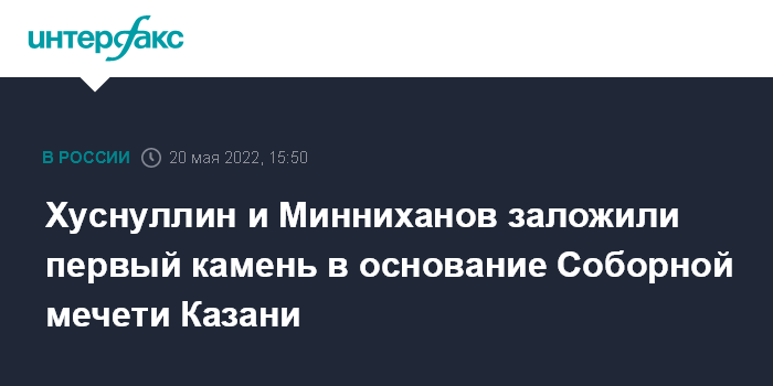 Москва. 20 мая. INTERFAX.RU - Торжественная закладка памятного камня в основание будущей Соборной мечети Казани состоялась в пятницу, участие в ней приняли вице-премьер РФ Марат Хуснуллин и президент Татарстана Рустам Минниханов.