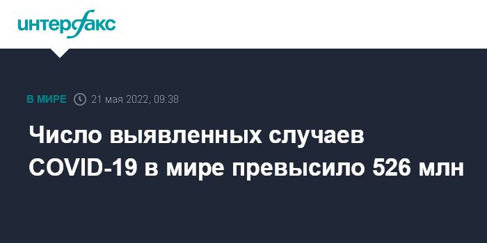 Москва. 21 мая. INTERFAX.RU - Число зарегистрированных случаев заражения коронавирусом в мире на утро субботы достигло 526 901 204, свидетельствуют данные американского университета Джонса Хопкинса.