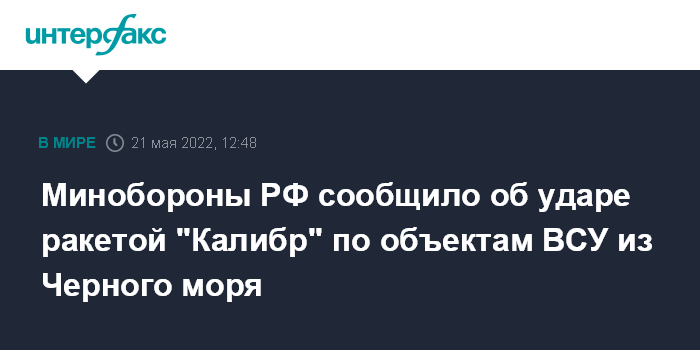 Москва. 21 мая. INTERFAX.RU - Министерство обороны России сообщило, что удар крылатой ракетой "Калибр" по цели на территории Украины нанесен кораблем из акватории Черного моря.
