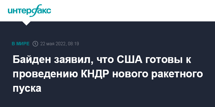 Москва. 22 мая. INTERFAX.RU - Президент США Джо Байден заявил в воскресенье, что США готовы к возможности того, что Северная Корея вскоре проведет новое испытание ракеты.