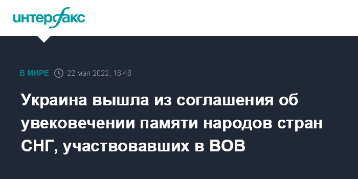 Москва. 22 мая. INTERFAX.RU - Украинский парламент поддержал выход Украины из соглашения об увековечении памяти о мужестве и героизме народов стран-участниц СНГ в Великой Отечественной войне 1941-1945 годов.