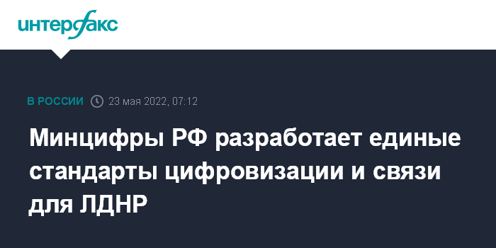 Москва. 23 мая. INTERFAX.RU - Вице-премьер Дмитрий Чернышенко поручил Минцифры разработать единые стандарты цифровизации и обеспечения связью территорий Донецкой и Луганской народных республик (ДНР и ЛНР), шефство над которыми берут регионы России, заявил он в ходе совещания с руководителями цифровой трансформации федеральных и региональных органов власти, сообщили "Интерфаксу" в аппарате вице-премьера.