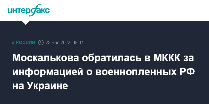 Москва. 23 мая. INTERFAX.RU - Уполномоченная по правам человека в РФ Татьяна Москалькова обратилась в Международный Комитет Красного Креста (МККК) с просьбой предоставить информацию о российских военнопленных в Украине и помочь с организацией их посещения, сообщила омбудсмен "Интерфаксу" в понедельник.