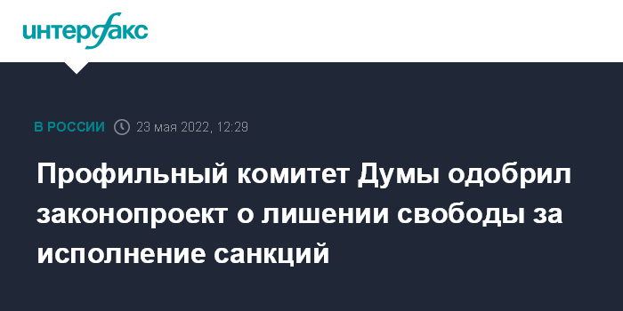 Москва. 23 мая. INTERFAX.RU - Комитет Госдумы по госстроительству и законодательству рекомендовал принять в первом чтении законопроект № 102053-8 с поправками в Уголовный кодекс об ответственности за исполнение антироссийских санкций на территории России.