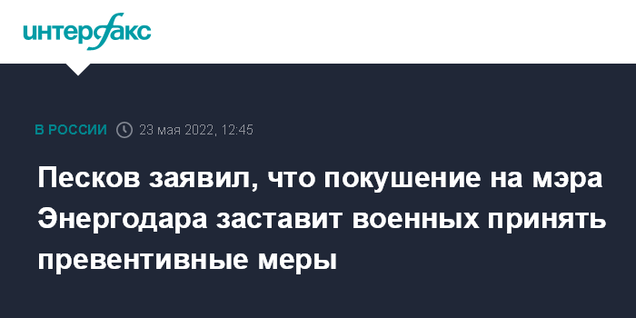 Москва. 23 мая. INTERFAX.RU - Покушение на мэра Энергодара (Запорожская область Украины) Андрея Шевчика утром 22 мая является терактом, это происшествие заставляет российских военных принимать превентивные меры, заявил журналистам пресс-секретарь президента РФ Дмитрий Песков.