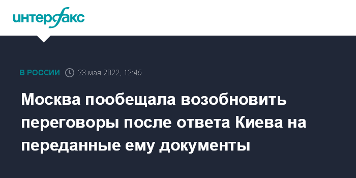 22 мая Мединский возложил на Киев ответственность за прекращение контактов. По его словам, месяц назад российская сторона передала украинской делегации проект договора, где ряд позиций был уже согласован, но с тех пор Киев никак на это не ответил. Он добавил, что для встречи на высшем уровне должны быть подготовлены итоговые документы в высокой степени готовности, чтобы президенты могли их подписать.