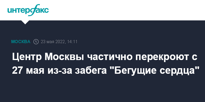Москва. 23 мая. INTERFAX.RU - Ряд центральных улиц Москвы перекроют с 27 по 28 мая из-за проведения благотворительного забега "Бегущие сердца", сообщает департамент транспорта и развития дорожно-транспортной инфраструктуры столицы.