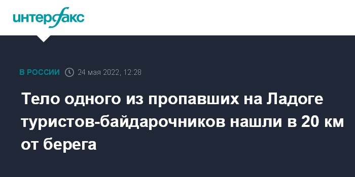 Москва. 24 мая. INTERFAX.RU - Тело одного из трех туристов-байдарочников, пропавших 3 мая в акватории Ладожского озера, обнаружили в карельском Приладожье, сообщает на своей странице в соцсети "ВКонтакте" администрация Сортавальского района.