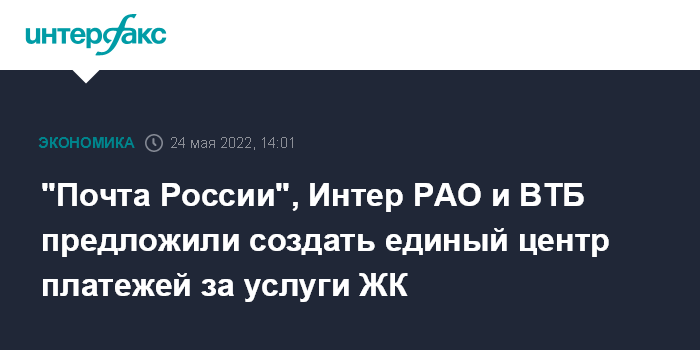 Москва. 24 мая. INTERFAX.RU - АО "Почта России", ПАО "Интер РАО ЕЭС" и ВТБ предлагают создать единый центр платежей за жилищно-коммунальные услуги в составе ГИС ЖКХ. По мнению авторов идеи, это позволит сделать ценообразование прозрачным и повысить выручку поставщиков услуг, рассказали "Интерфаксу" источники, знакомые с данной инициативой.