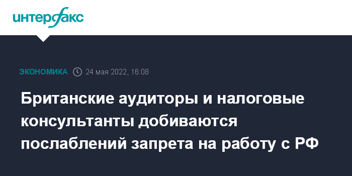 Москва. 24 мая. INTERFAX.RU - Британские аудиторы и консультанты по вопросам налогообложения видят необходимость в послаблениях к санкциям, запрещающим экспорт в Россию консалтинговых, бухгалтерских и PR-услуг, пишет газета Financial Times.