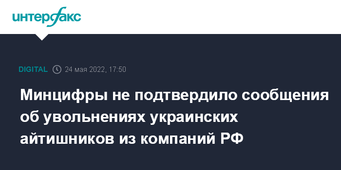 Москва. 24 мая. INTERFAX.RU - Минцифры РФ не подтверждает информацию о массовых увольнениях или принудительном переводе IT-специалистов украинского происхождения на другие должности и предупреждает о недопустимости такой дискриминации, сообщила пресс-служба ведомства во вторник.