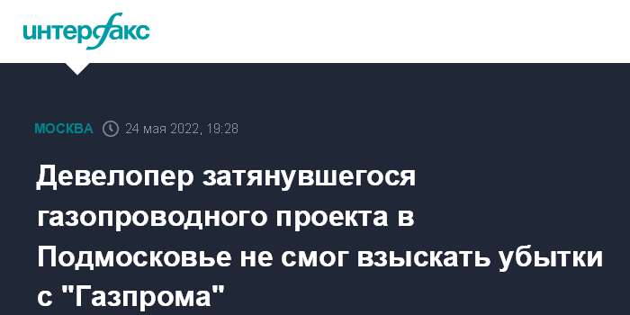Москва. 24 мая. INTERFAX.RU - Девелопер частного газопровода и газораспределительной станции в Пушкинском районе Московской области не смог списать на "Газпром" свои убытки от неуспешной реализации проекта. Арбитражный суд города Москвы отказал ООО "Инжинвестком" во взыскании с концерна 297 млн рублей убытков. Резолютивная часть объявлена 18 марта, полный текст решения изготовлен 18 мая.