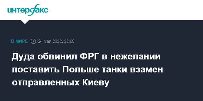 Москва. 24 мая. INTERFAX.RU - Польский президент Анджей Дуда во вторник обвинил ФРГ в нарушении договоренностей о поставках Польше немецких танков взамен польских, переданных Варшавой Украине.