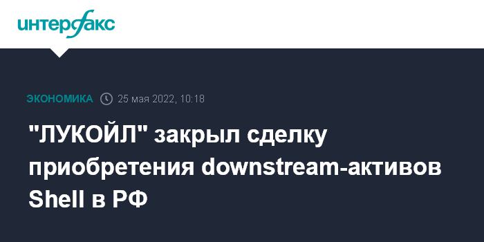 Москва. 25 мая. INTERFAX.RU - "ЛУКОЙЛ" подписал итоговые документы в рамках сделки по продаже активов Shell на территории России – сети АЗС, расположенной преимущественно в Центральном и Северо-Западном федеральных округах, а также завода по производству смазочных материалов в Тверской области, сообщает российская компания.